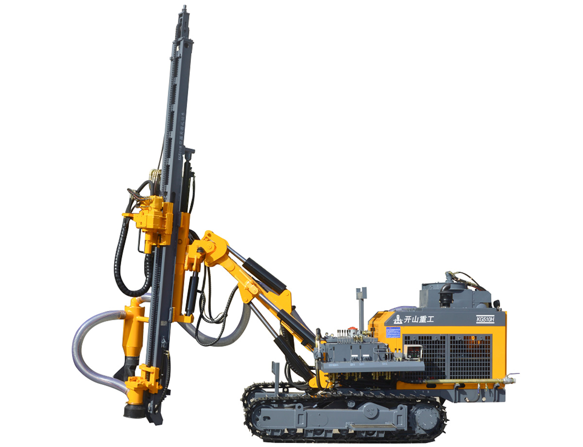 KG510/KG510H型露天潛孔鉆車是應(yīng)國家對(duì)環(huán)保要求而進(jìn)行升級(jí)的一款新設(shè)備。配備玉柴四缸國三發(fā)動(dòng)機(jī),滿足國家對(duì)排放和環(huán)保的要求。采用柱塞行走馬達(dá),折邊履帶架和工程四輪一帶,提高工作壓力,增加爬坡性能。增大俯仰和舉臂油缸,滿足極限位置使用要求。同時(shí)對(duì)液壓系統(tǒng)升級(jí),增大系統(tǒng)流量,提高回轉(zhuǎn)轉(zhuǎn)速。回轉(zhuǎn)器采用雙馬達(dá)減速器,增大回轉(zhuǎn)扭矩和轉(zhuǎn)速。對(duì)加大提升油缸和鏈條,提高提升力和可靠性。加固導(dǎo)軌和增加滑板上下耐磨板,延長使用壽命。導(dǎo)軌采用傾斜安裝,方便操作和觀察。罩殼采用加厚型材折邊,增加強(qiáng)度和剛性,增加起吊吊環(huán),方便裝卸吊裝。